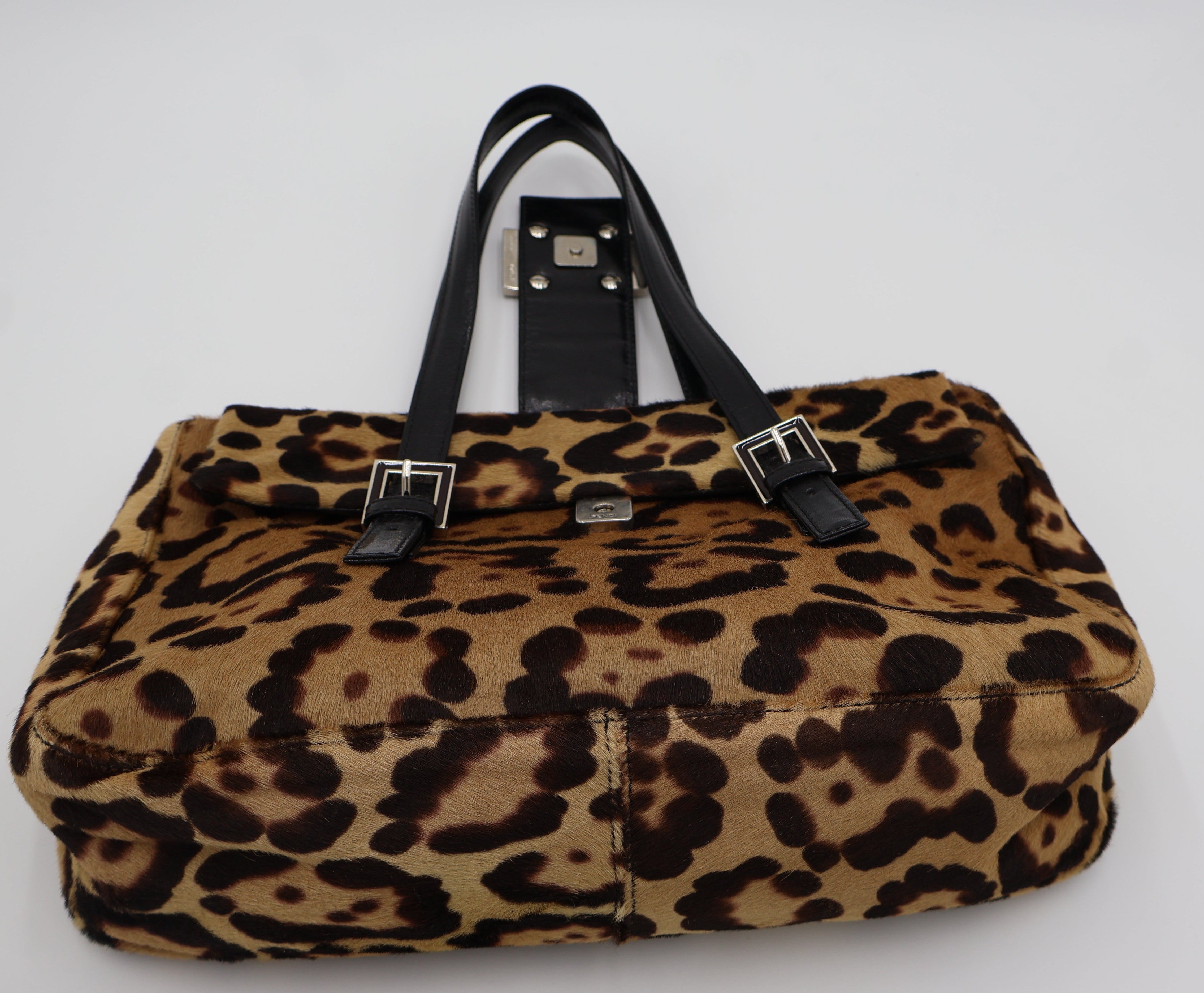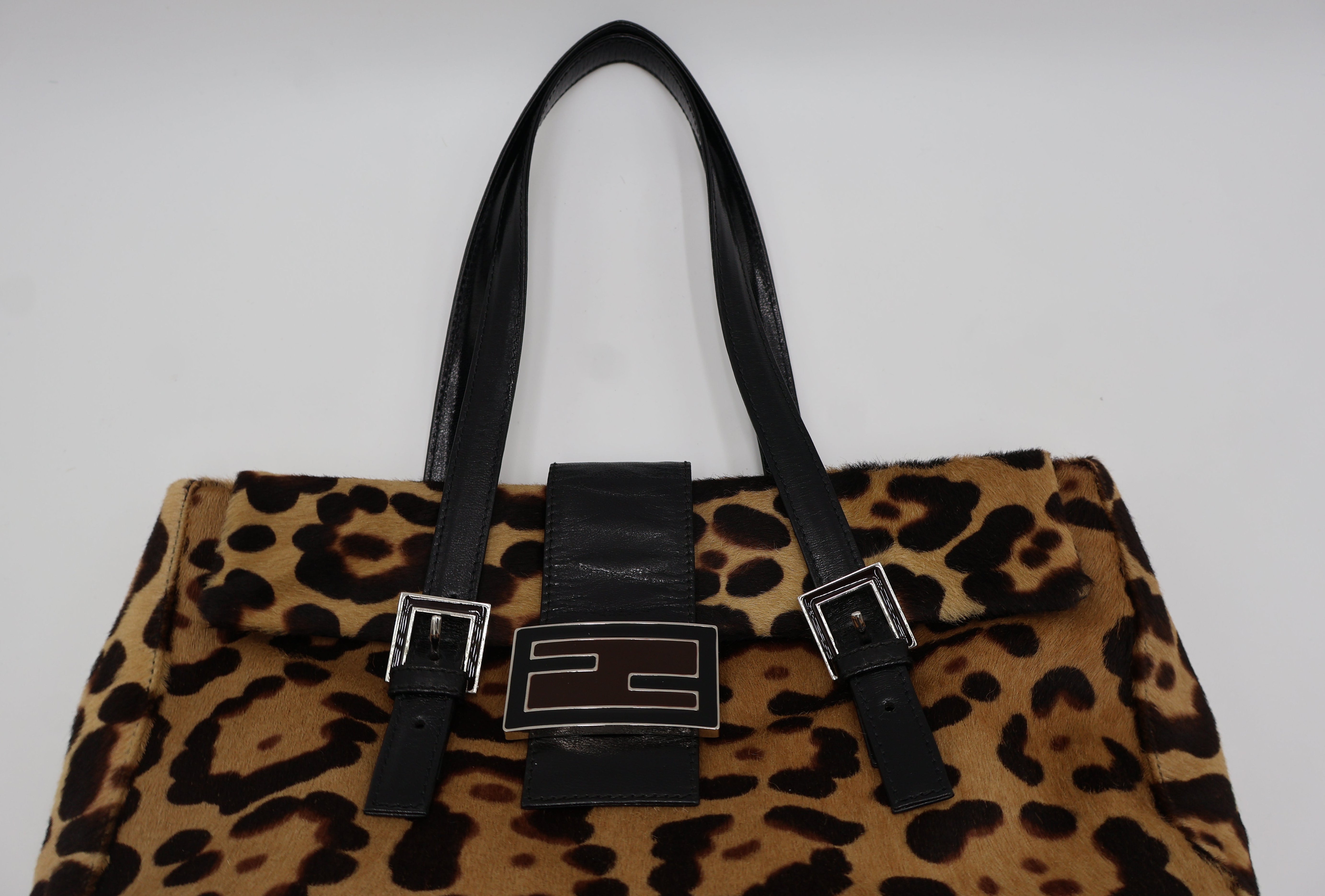A rare vintage Fendi Baguette crafted in leopard pony hair with black leather straps and silver-tone FF buckle hardware. This collectible variation features the classic baguette flap design with a roomy interior, magnetic closure, and double leather straps for easy shoulder carry. Soft pony hair and sleek leather detailing give this piece its signature early-2000s Fendi look.