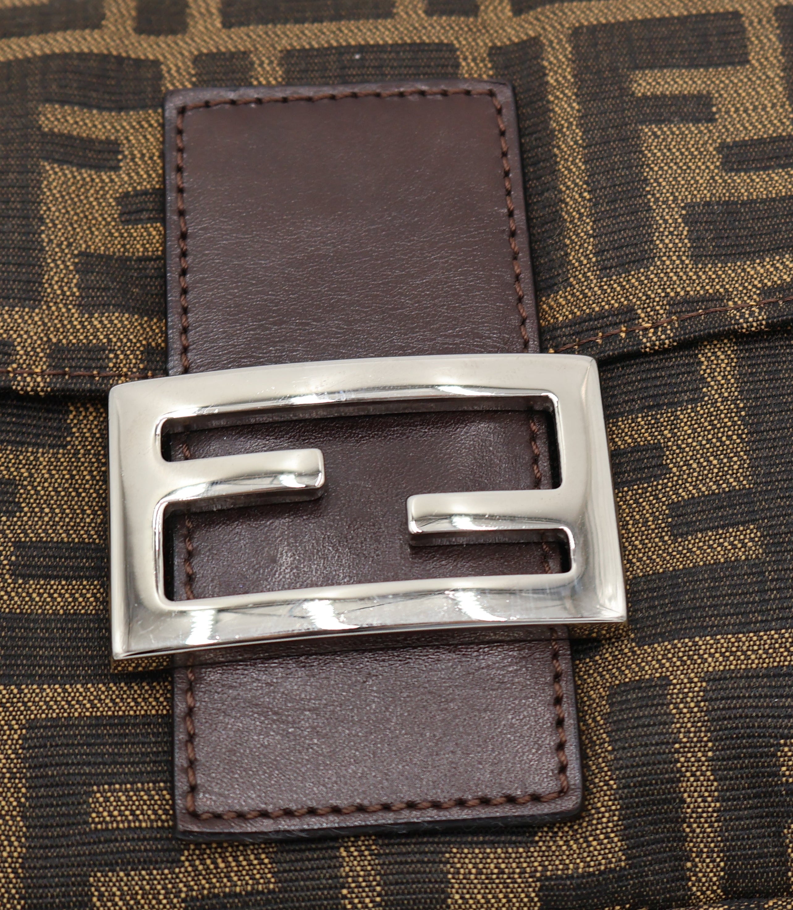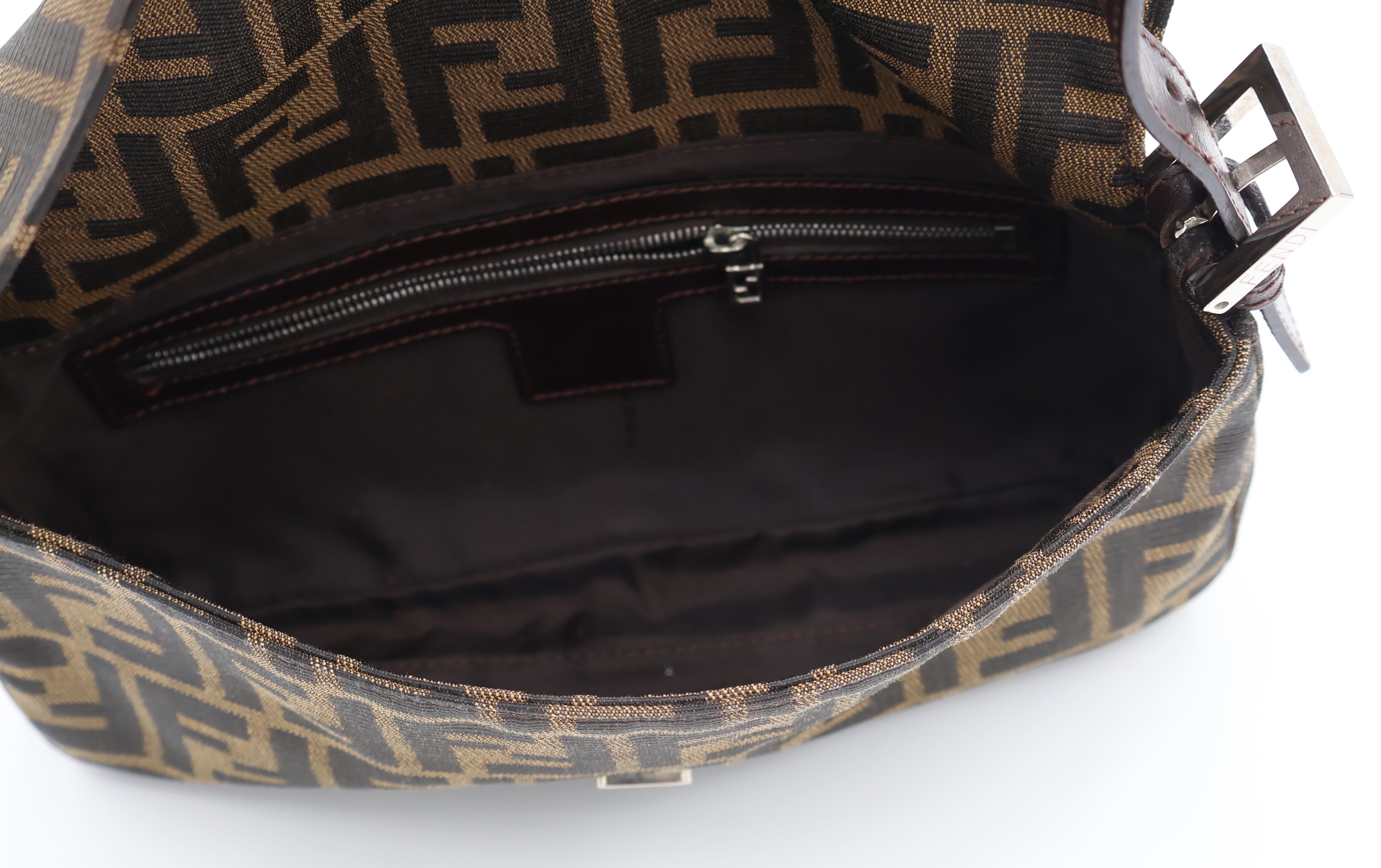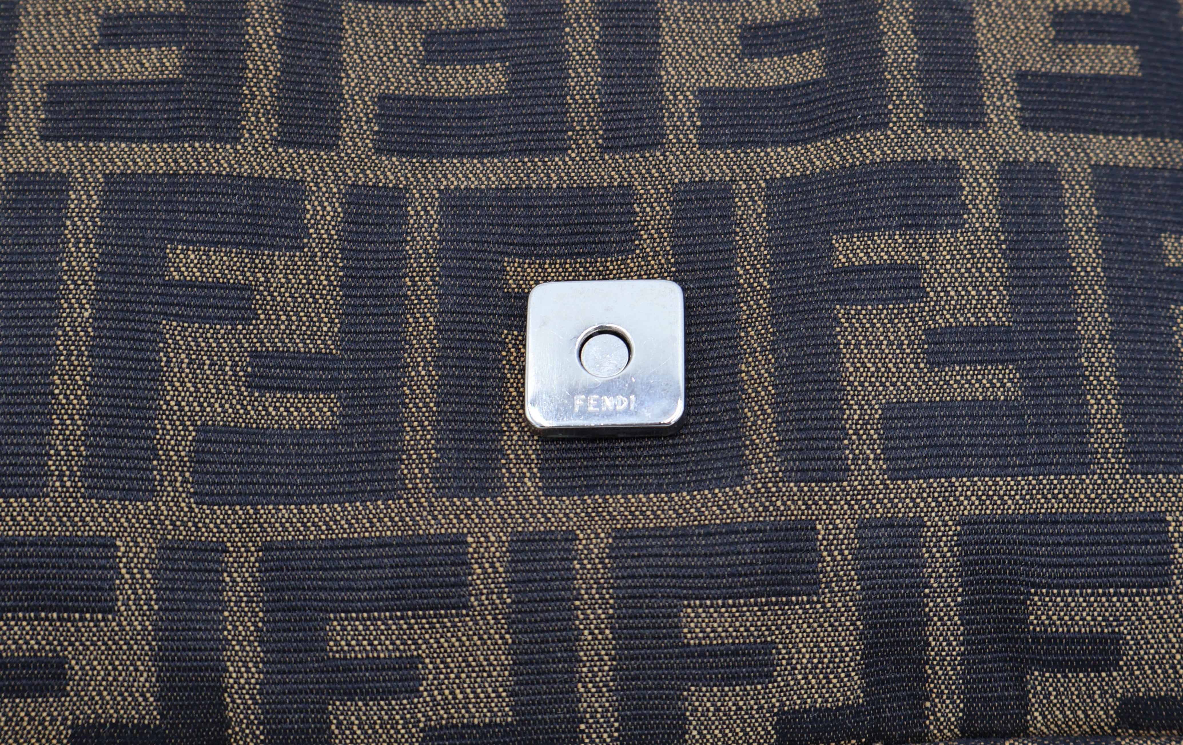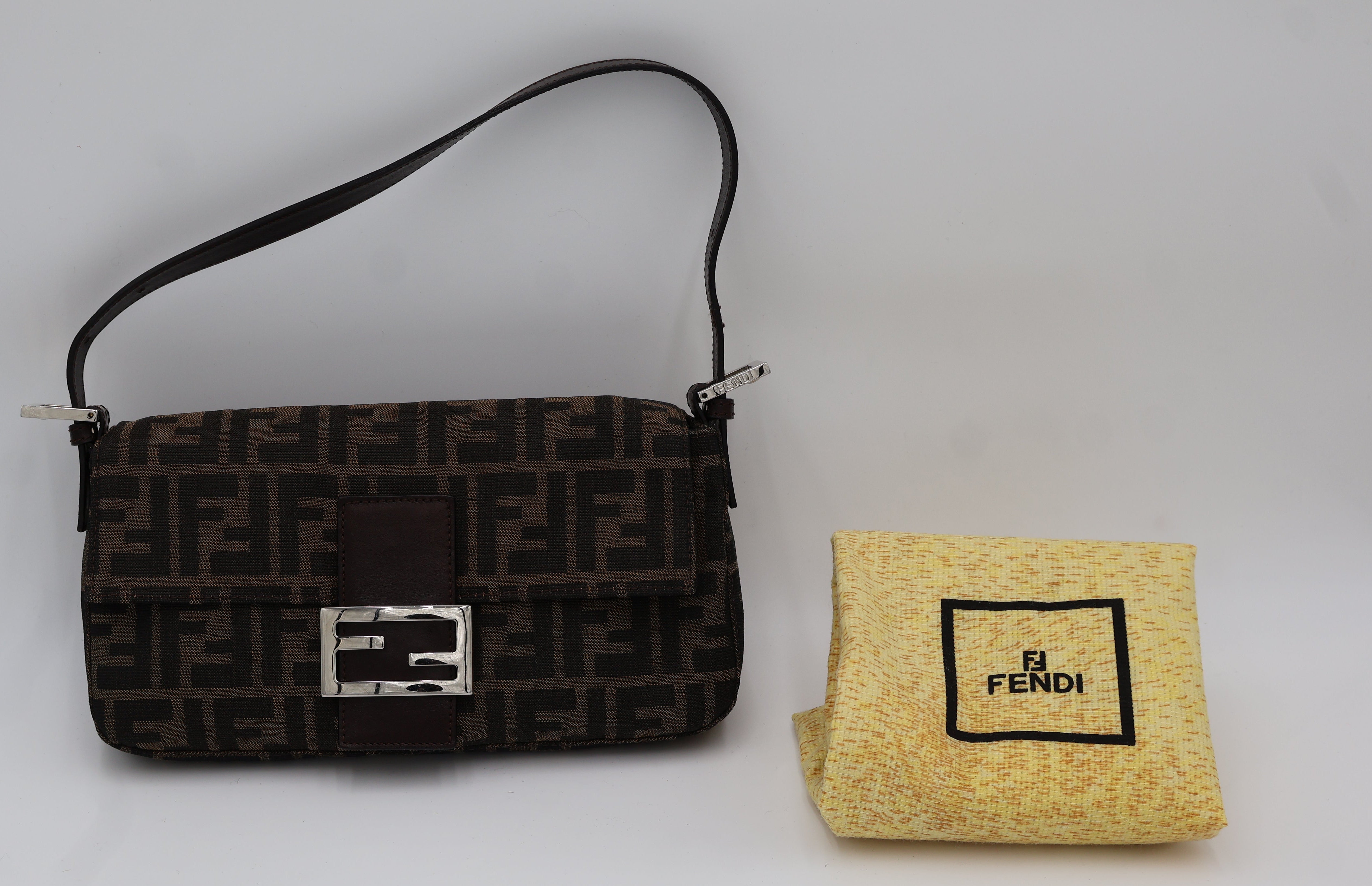 A classic vintage Fendi Baguette in the signature brown Zucca canvas with brown leather trim and silver-tone FF buckle. This early-2000s silhouette features a magnetic flap closure, adjustable leather strap, and a clean interior with zip pocket. A timeless and highly collectible Fendi essential.